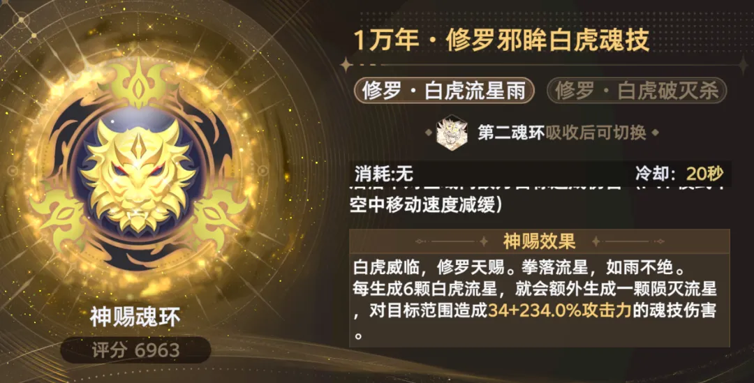 接着便是戴沐白的神赐魂环,这个神赐神赐魂环不管大家是选择2魂技还是6魂技,其更多增加的都是魂技方面的伤害,下边维一也用白虎123魂技的打法和456普攻流的打法,分别给大家展现一下这个神赐魂环的增益到底有多高,前提还是把戴沐白的暴击率压到7%以下,外加部分其它措施来最大化限制暴击等浮动伤害的影响。