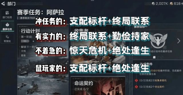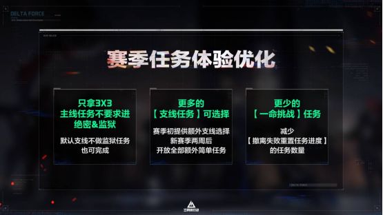 赛季任务方面,官方称减少了“撤离失败重置任务进度”以及“需前往潮汐监狱及绝密地图”的任务数量,并增加了初期可选的行动路线,大幅优化了难度。