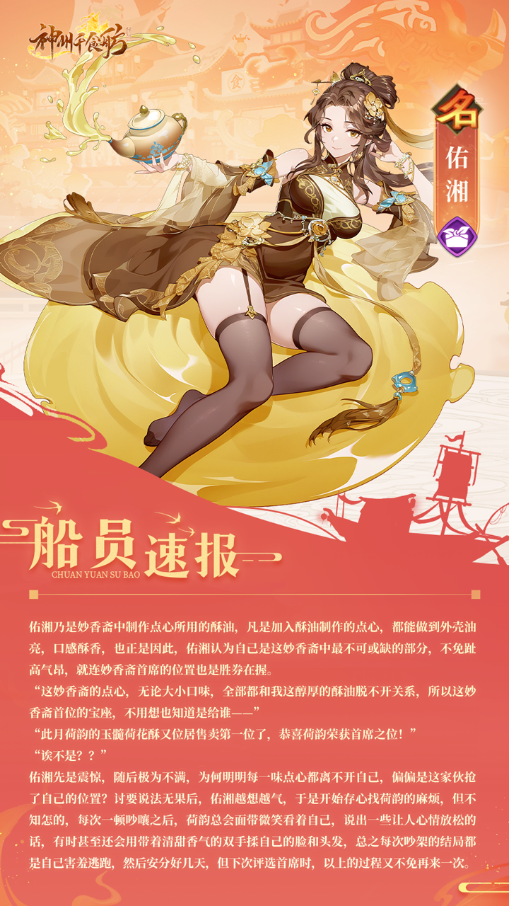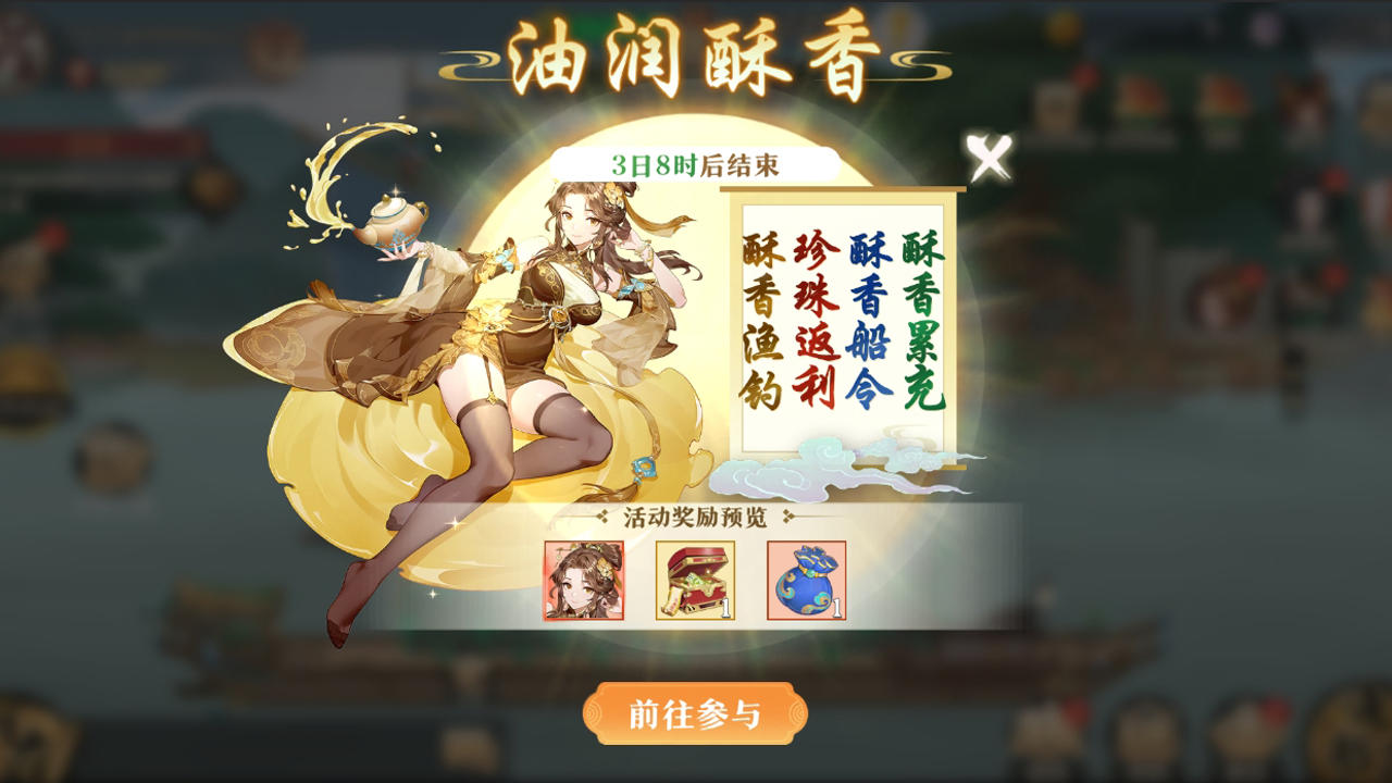 ①酥香渔钓:舫主可以通过消耗活动道具进行钓鱼,有一定几率获得新名级船员<佑湘>