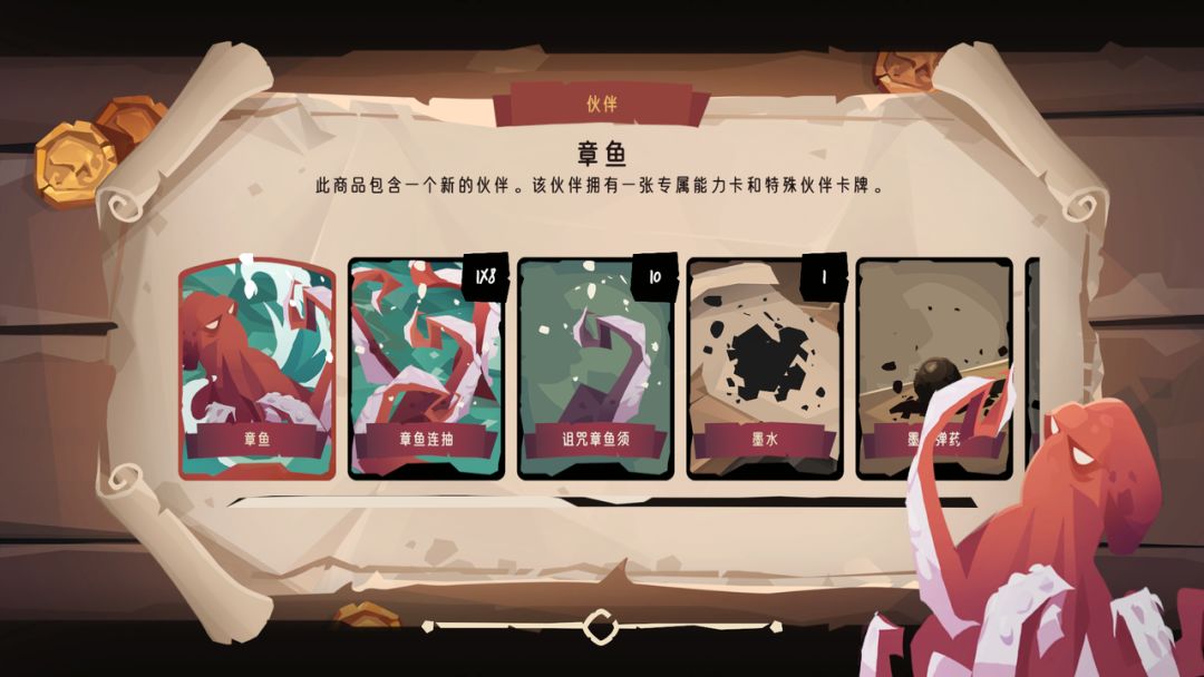 本伙伴卡牌包中共有1张专属能力卡及8张专属卡牌,【章鱼】伙伴能力卡将默认加入战斗初始卡组,其余专属卡牌可以在旅程中获取噢~