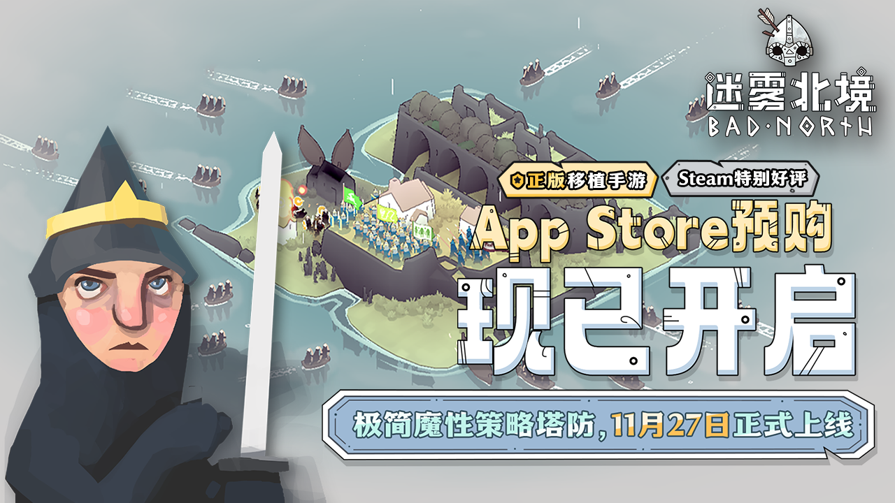 由Oskar Stålberg 官方授权,良心工作室代理,Steam特别好评,轻度实时策略塔防-正版移植手游《迷雾北境》(Bad North)将于11月27日上午10点正式与大家见面!