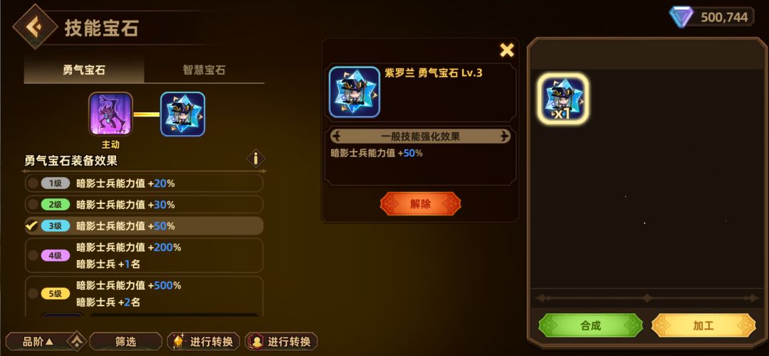 -宝石合成:当技能宝石的英雄、等级、种类相同时,可以消耗3颗合成1颗更高等级的技能宝石。