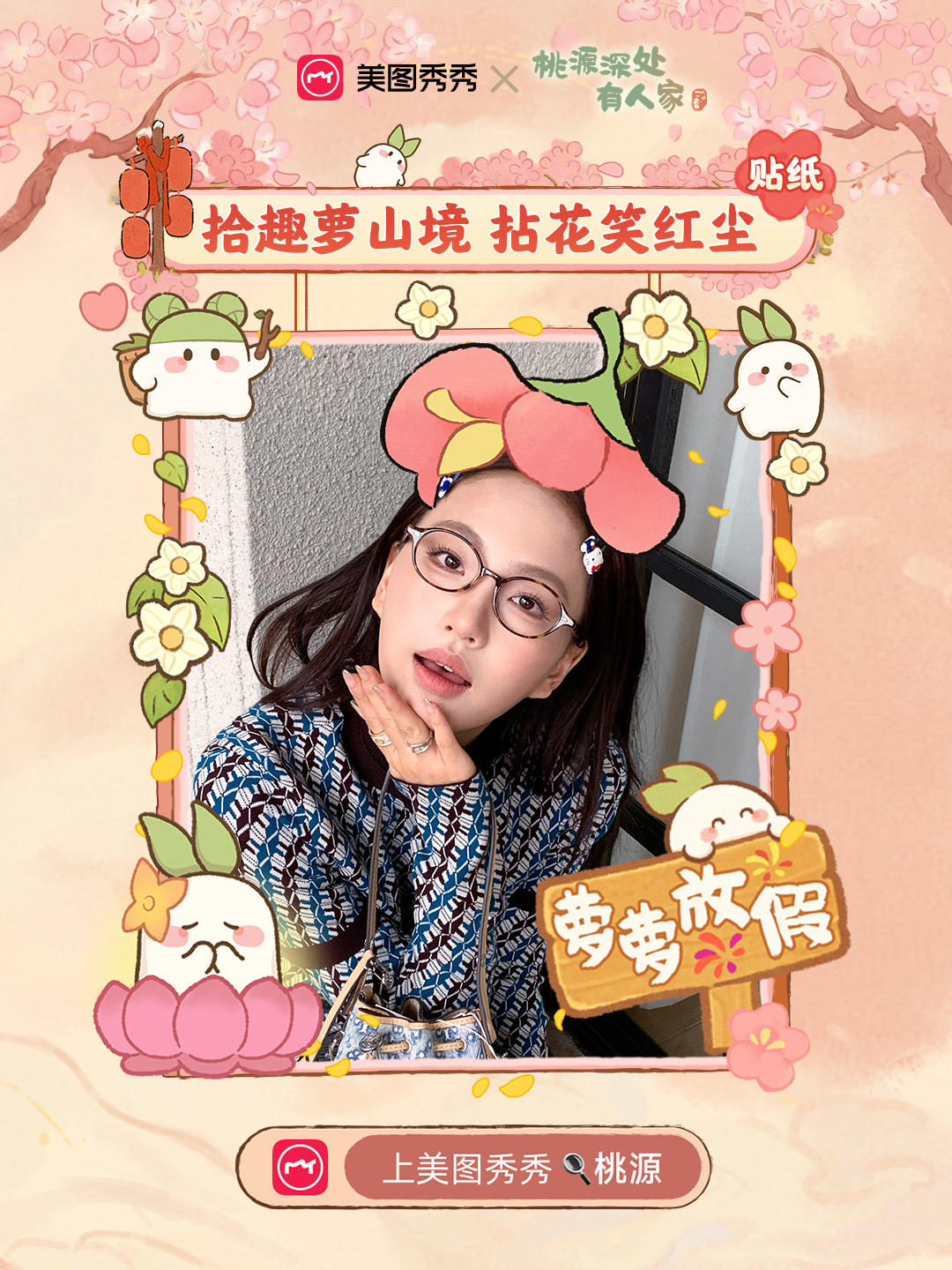 桃源深处有人家x美图秀秀 联动贴纸上线!如果山民们也跟萝一样喜欢记录生活,那不妨来美图秀秀和萝一起DIY你的专属美照——①打开美图秀秀,②搜索桃源,③使用系列贴纸、边框、海报拼图等模板,让萝加入你的生活吧~