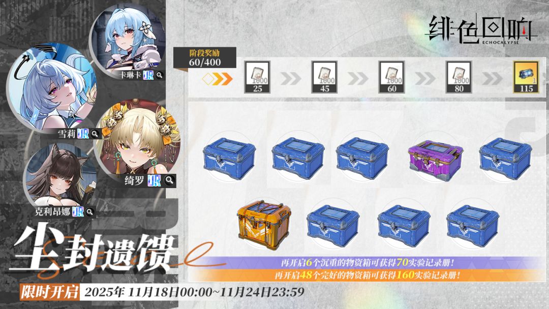 ※本期「尘封遗馈」活动结束后,唤醒者持有的物资管理卡、陈旧钥匙、实验记录不会清除,可以在下一期「尘封遗馈」中继续使用。