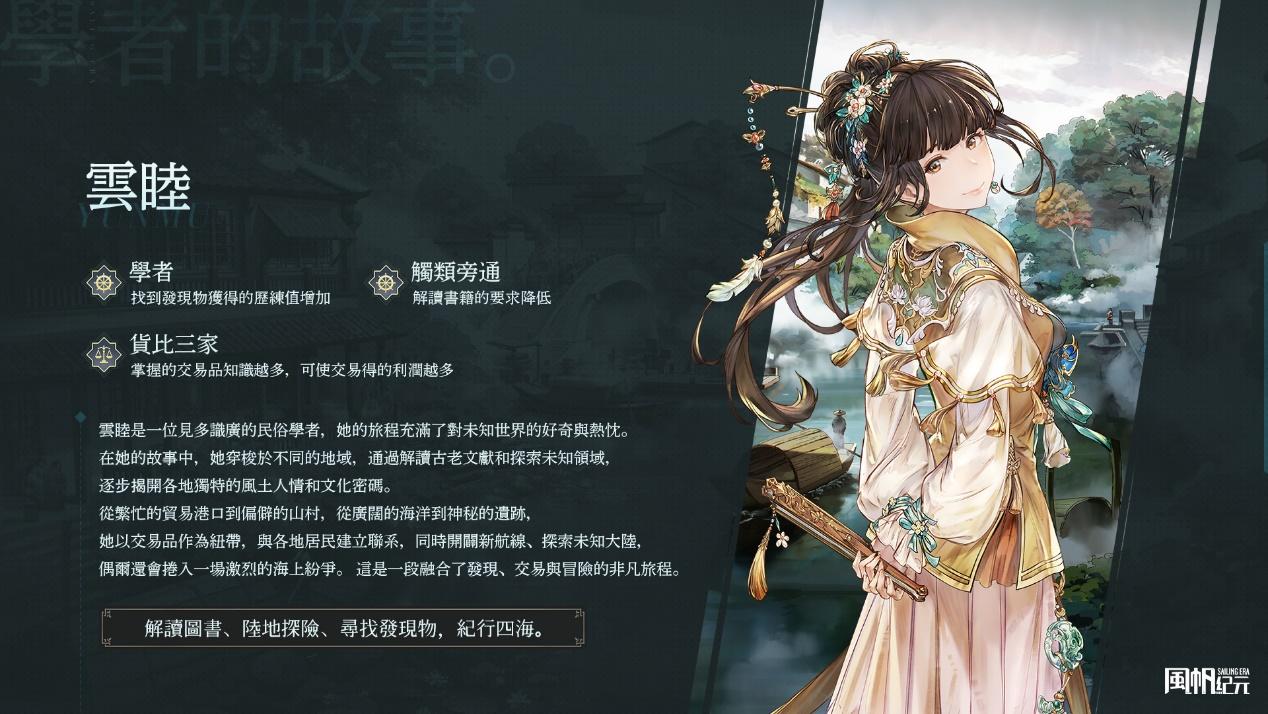云睦出身漳州商人世家,是一位才华横溢的女性民俗学者。她精通多国语言,热爱探寻不同地区的地理风貌和人文民俗。