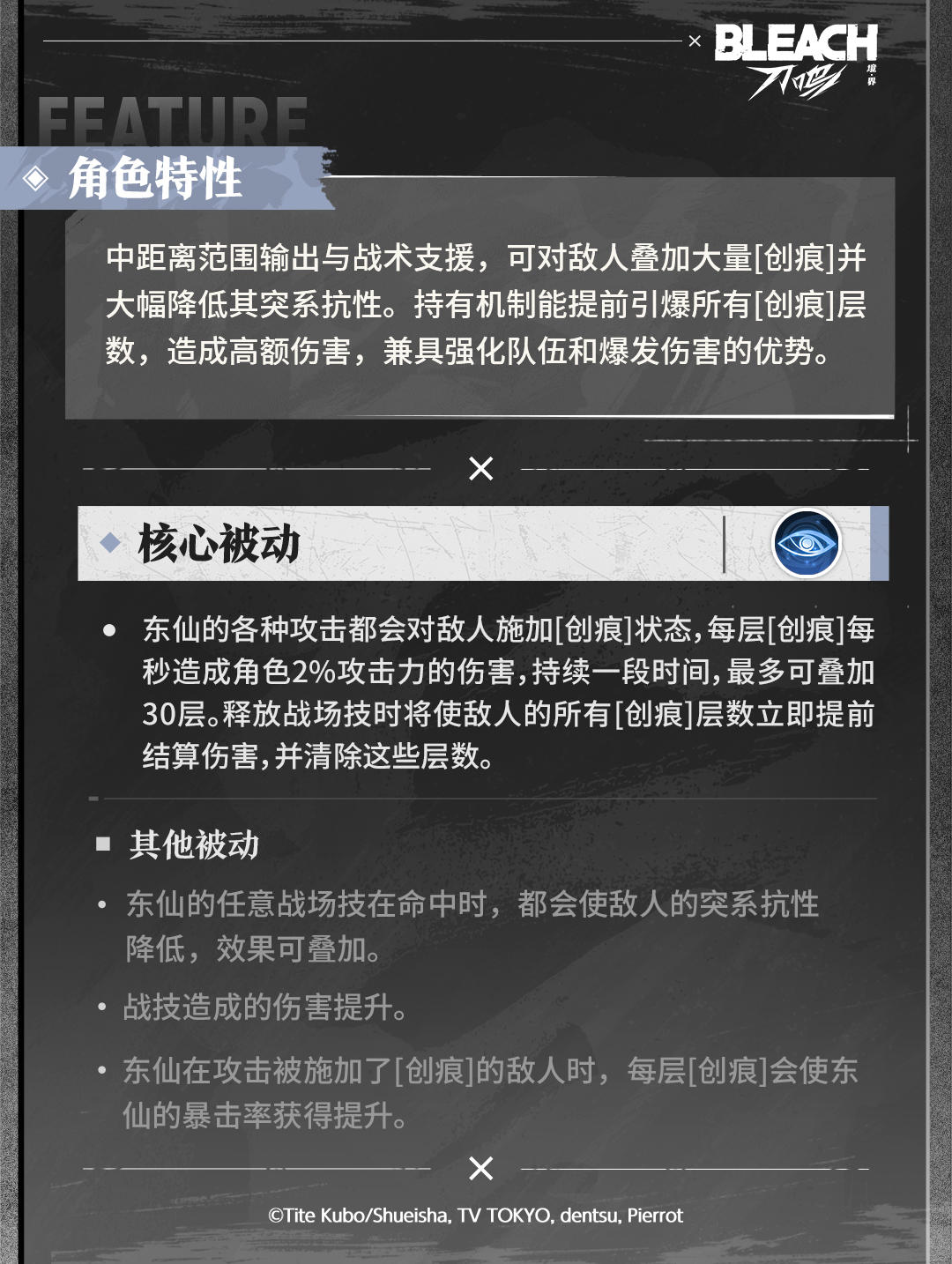 游戏中的东仙是中距离范围输出与支援角色,可对敌人叠加大量【创痕】,大幅降低敌人突系抗性。能提前引爆所有【创痕】叠加层数,造成高额伤害,兼具强化队伍和爆发伤害的优势。