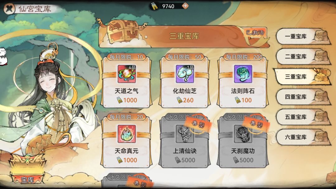 三层宝库一次性的丹方、心法突破道具购买,每个月法则阵石全部购买;
