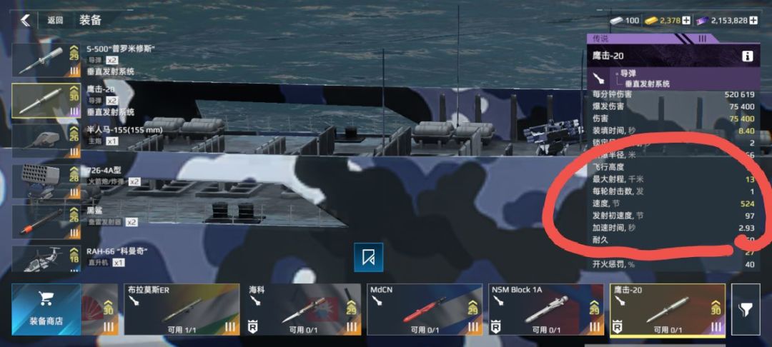 首先导弹推荐经典的一防空s500和一输出鹰击20,今天评论区在f127攻略中推荐标准六,其实是没问题的,但是关键是标准六需要一千五百金条,还是太贵了,为了增加600的对舰输出秒伤付出一千五百金条,这个看大伙怎么取舍,对舰导弹选择鹰击20主要美金商店并没有特别好用的导弹,就随便选了,也许大伙有自己的导弹,但是不知道怎么选择,这里就说一下,按照图里的指标去选就对了,关键是看从最低速度到最高速度要花多长时间。