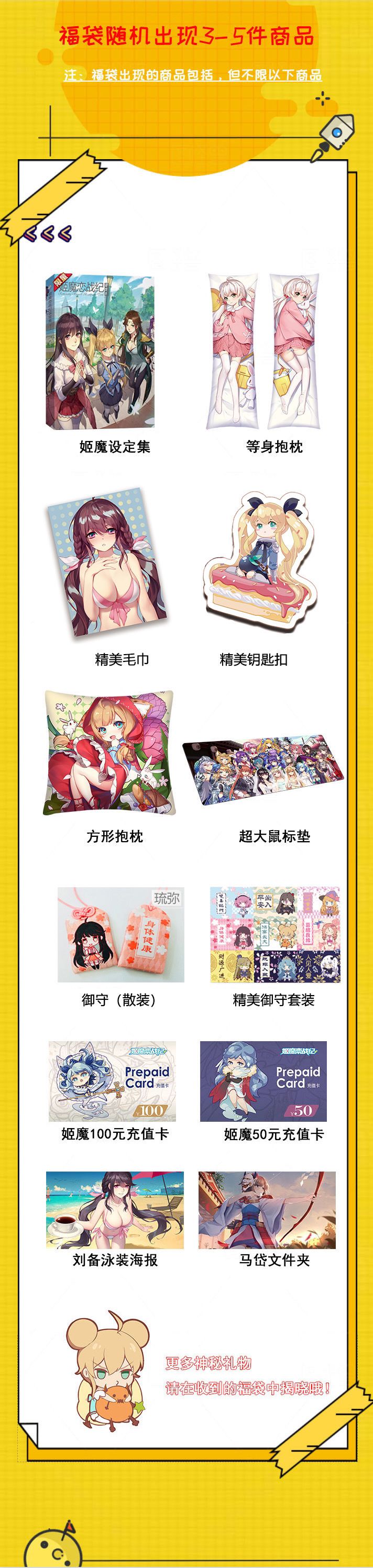 福袋内容含:设定集、方形抱枕、等身抱枕、御守精美套装、鼠标垫、御守(散装)、(莉坦&张飞)钥匙扣、高清刘备海报、《姬魔恋战纪》游戏充值卡以及限量款毛巾