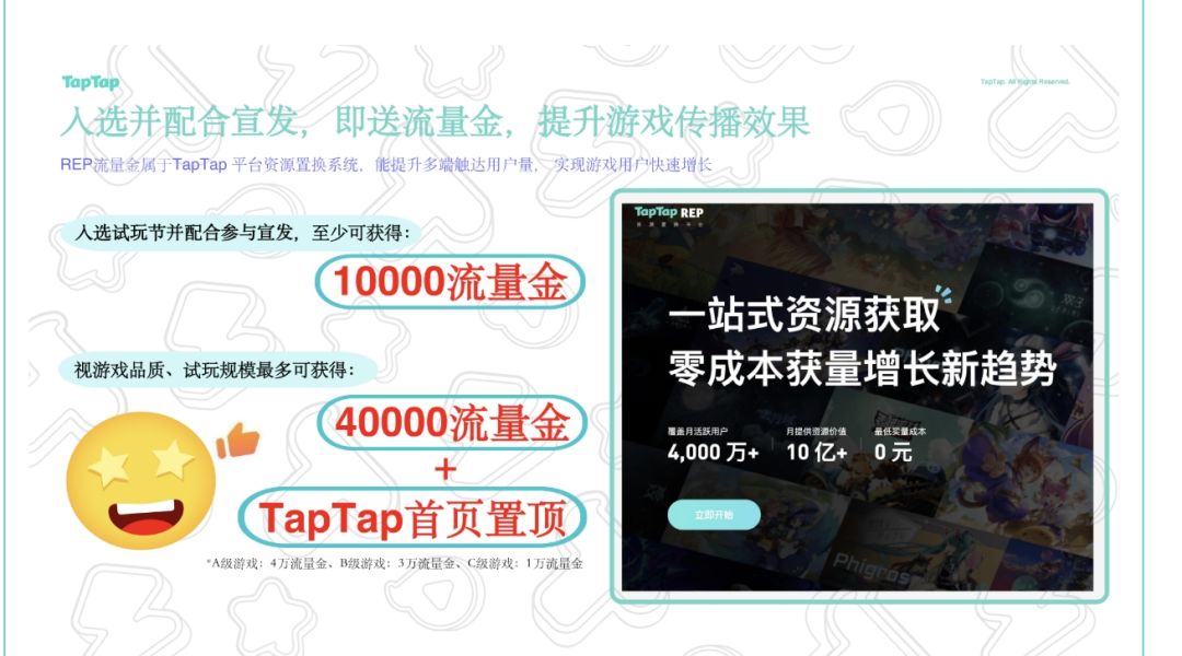 “ 发现好游戏” 是 TapTap 一直以来的品牌宗旨。“试玩节” 是 TapTap 为全体玩家打造为期多天的新游限时试玩活动 。活动期间会有特定的页面进行曝光,开发者可以通过活动提升游戏曝光,收集玩家反馈,甚至通过试玩活动为即将上线的游戏进行预热 。