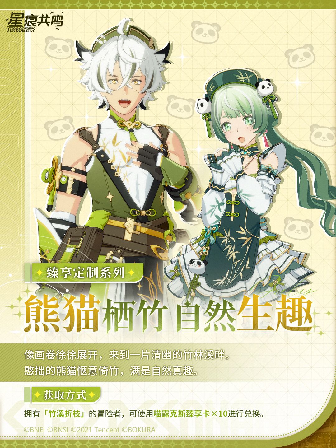 随设定册赠送系列单品、徽章、空间背景及情感动作解锁券。熊猫倚竹,人倚清溪,衣袂流转间皆是自然低语,冒险的旅途也有悠然惬意……