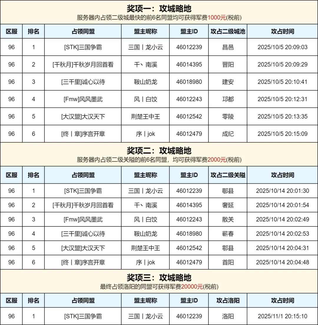 5、我们将于2025年11月17日,通过游戏内邮件,向对应获奖同盟的盟主发放领奖通知和领奖信息收集,请各位盟主注意查收游戏内邮件!