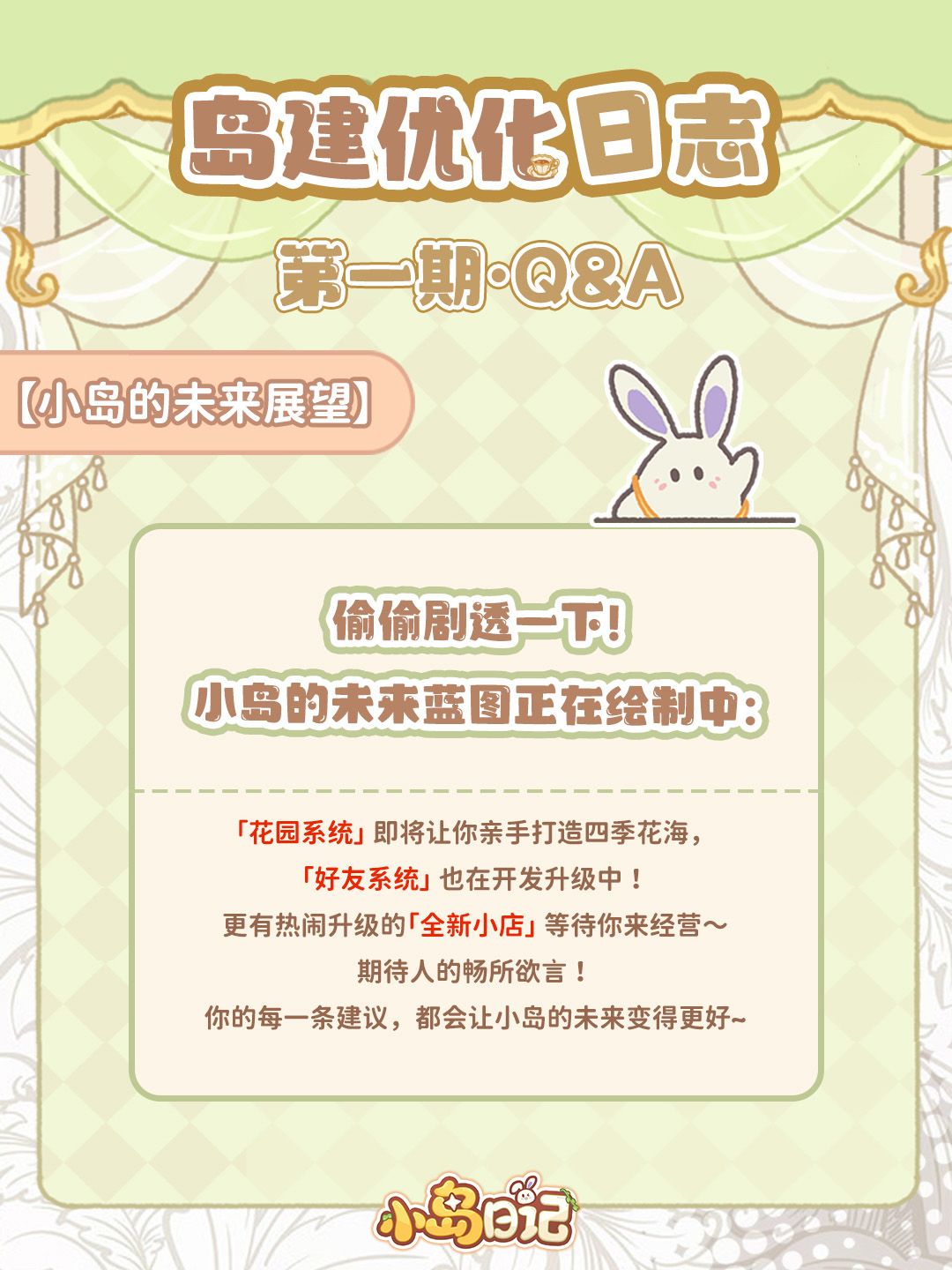 点击预约【小岛日记】,并将你对游戏的建议发在本帖评论区;我们将于11月28日在满足条件的岛民中,抽3位岛民送出限定周边【小岛帆布袋】!