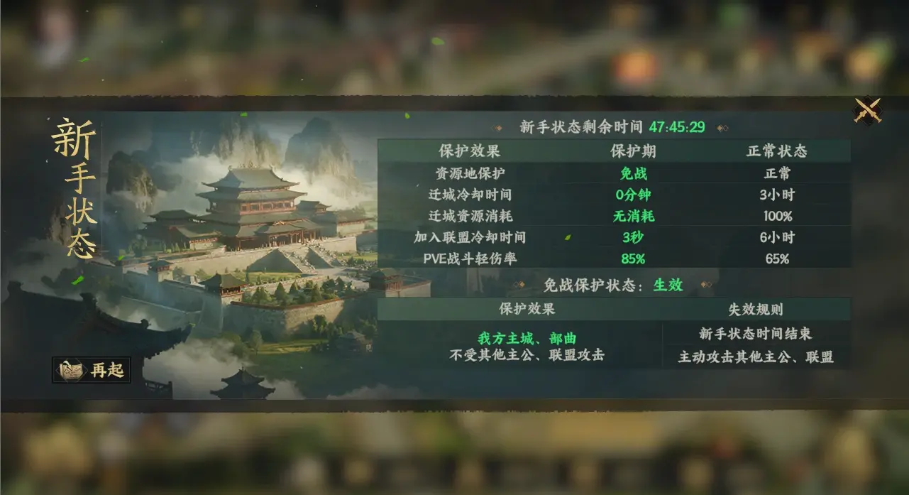 开局48小时为新手保护期,是发育黄金时间。期间主城与已占领的资源地不会受到攻击,但主动攻击其他玩家将立即失去保护!