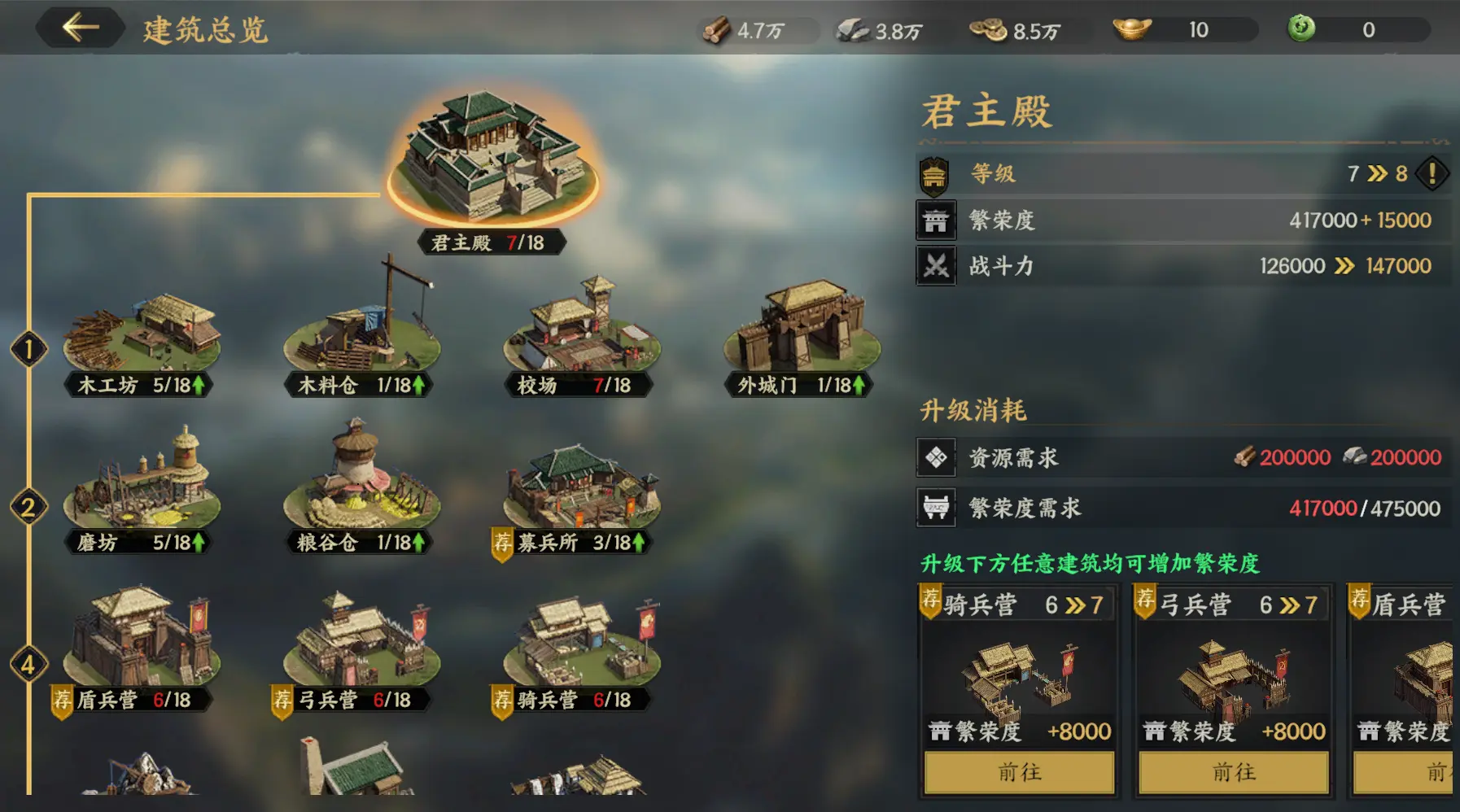 核心优先级:君主殿永远是第一位。校场可以升到7级开第三队,是前期队伍开荒质变的关键。并且根据自身开荒阵容来优先升级对应兵营,战力会明显提升。军事府能加带兵量,但前期资源吃紧,建议酌情升级。