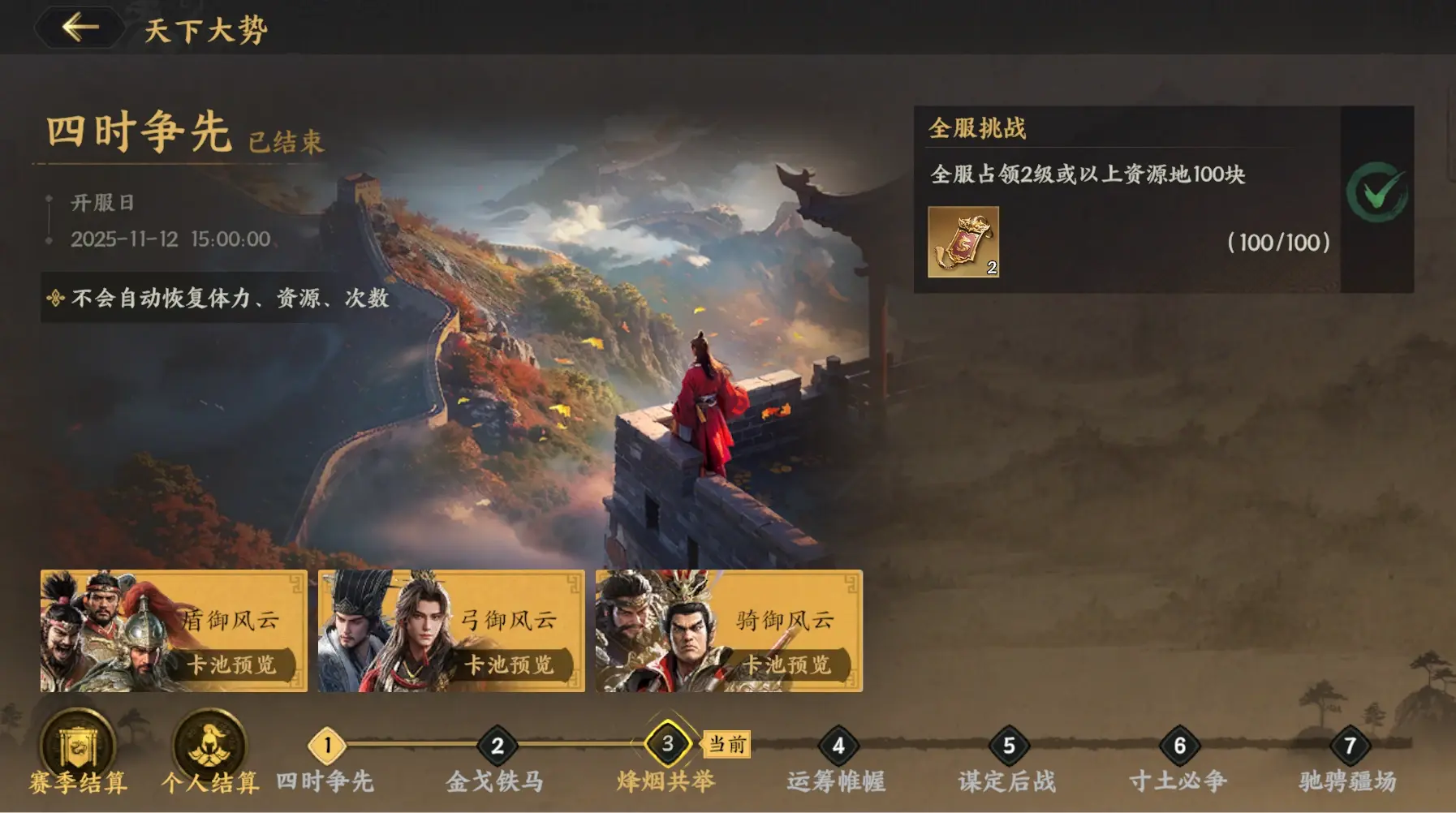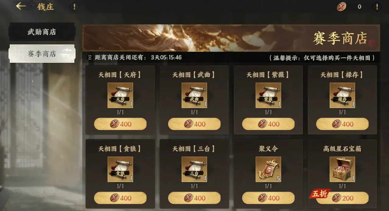 上赛季结算获得的荣誉积分记得去赛季商店兑换掉,都是实打实的好东西。优先兑换打折的武将技能经验和征募令,另外,免费的招募次数也要在赛季卡池里及时使用。