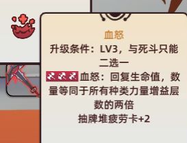 值得一说的是如果抽到了治疗包这张牌,有了足够的续航能力,那么在输出选择上还可以加入一些根据损失血量提高伤害输出的卡牌,比如狂热之刃: