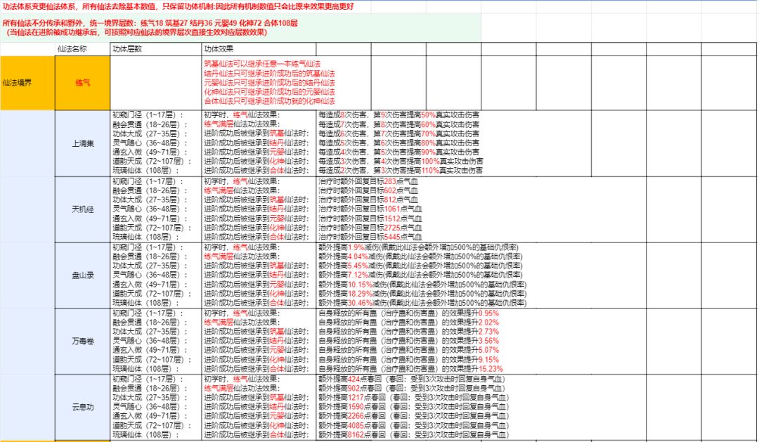 - 1) 老功法按照层数比例替换为对应层数的仙法,如老功法49层满功法,将会直接转换为仙法108层,老功法基础属性移除,老功体属性也将变为仙法属性