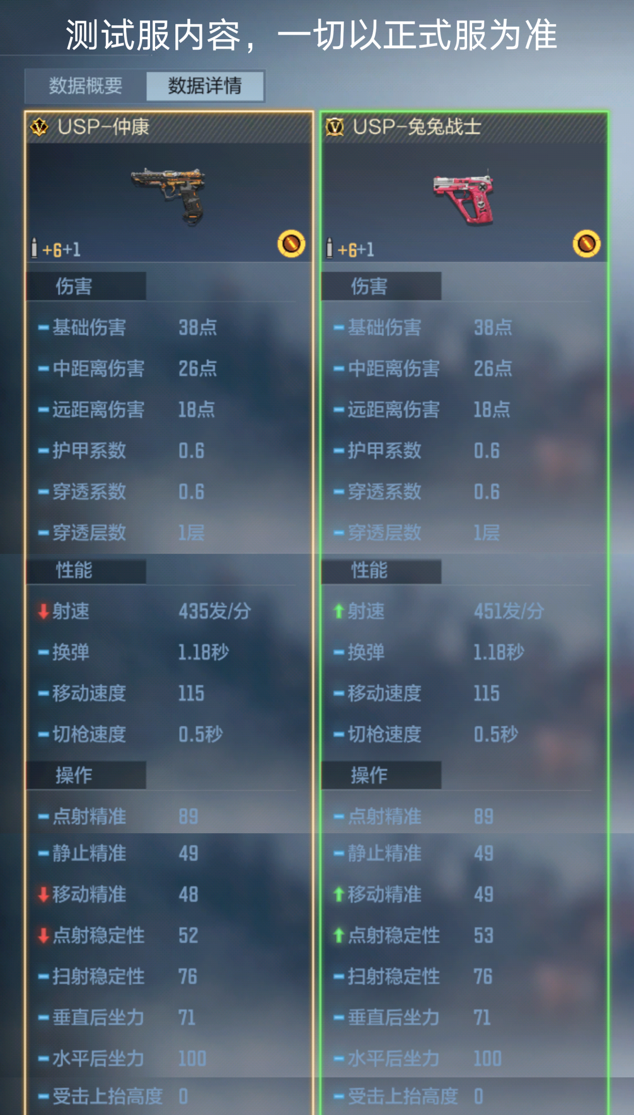 作为英雄级枪械,USP-兔兔战士的性能毋庸置疑,与最近推出的USP-仲康对比可以发现,伤害、穿透、换弹、移速等性能均一致,但是射速比USP-仲康高16发,可以是说是最强USP也不为过。