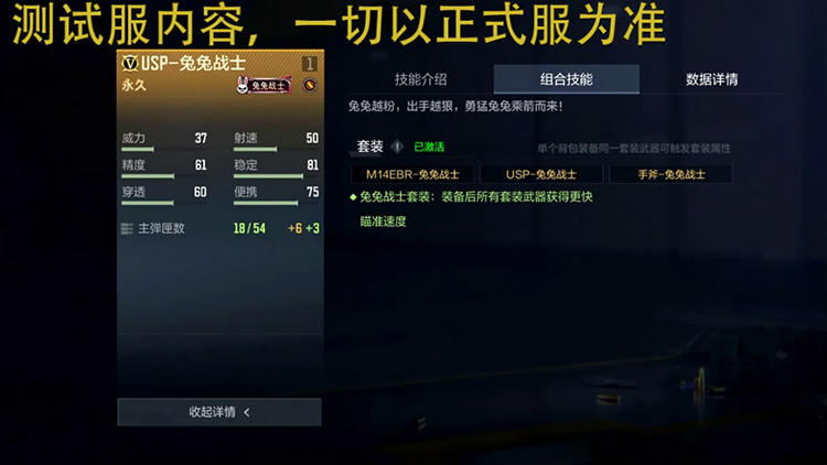 但该枪械共享兔兔战士套装带来的套装技能,在同时装备M14EBR-兔兔战士、USP-兔兔战士和手斧-兔兔战士后,即可激活该套装所有武器瞄准速度加快的能力。