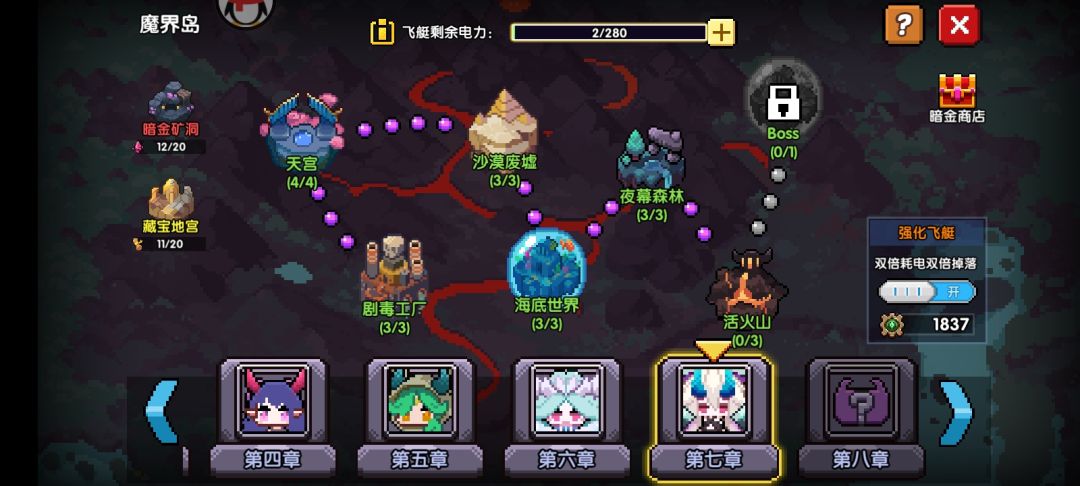 当你电量快刷完的时候留1电量,然后进去全部房间打了,这种叫魔界白嫖大法,很有必要的,不会浪费你什么东西(除了时间)。然后电池也可以类似操作,从而刷的更多,能量更加快到800。魔界岛每天会自动给你回复280电量,840电量上限,有空就肝肝吧,孩子!