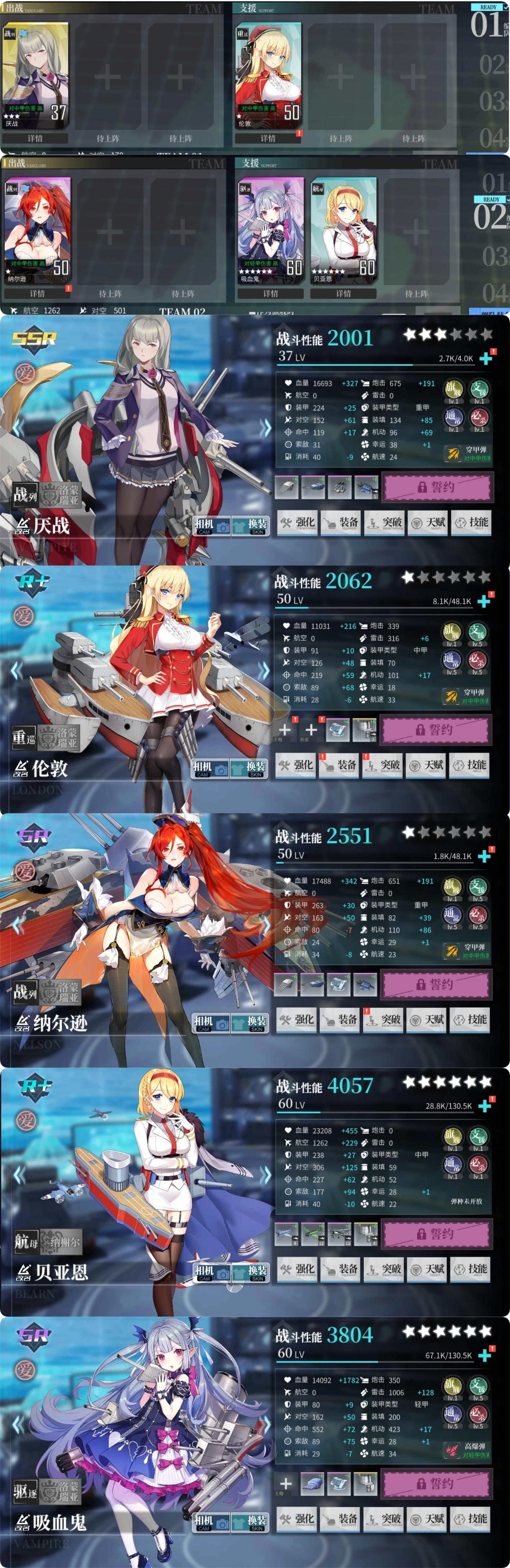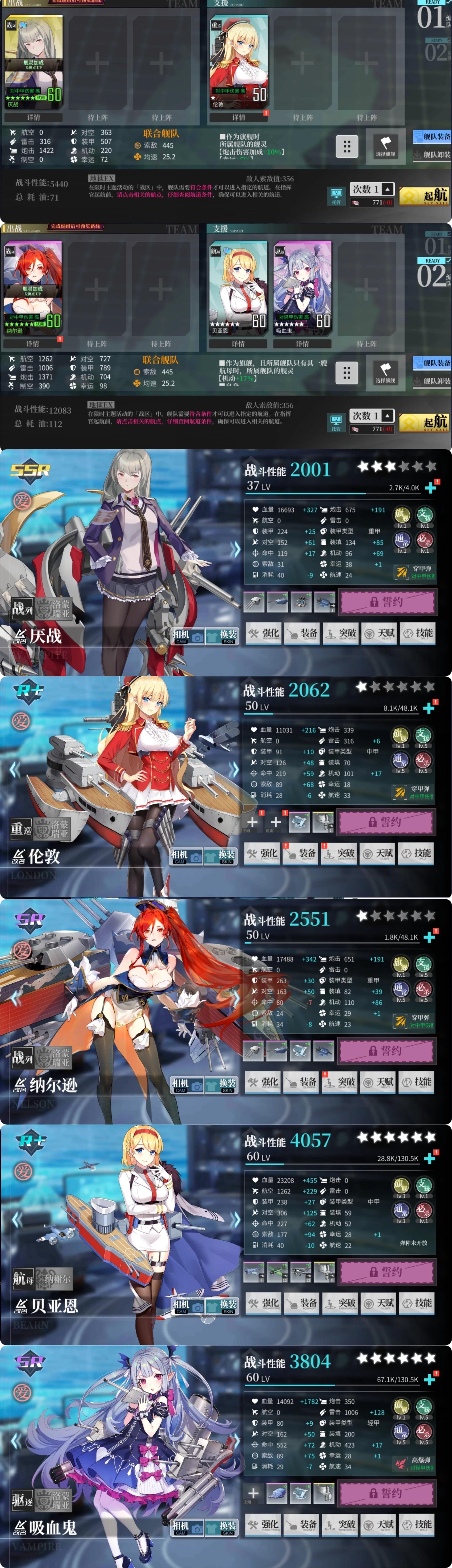 优化建议:一队看练度,练度够用可以酌情压掉哈曼,要带哈曼的情况下务必注意后排哈曼放战列之前。二队在厌战练度不够的情况下,选择伦敦+吸血鬼双奶,练度提升后优先压掉吸血鬼,选择保留伦敦让结算血量在半血以上,并将托管顺序换成222221。优化时注意索敌要求。