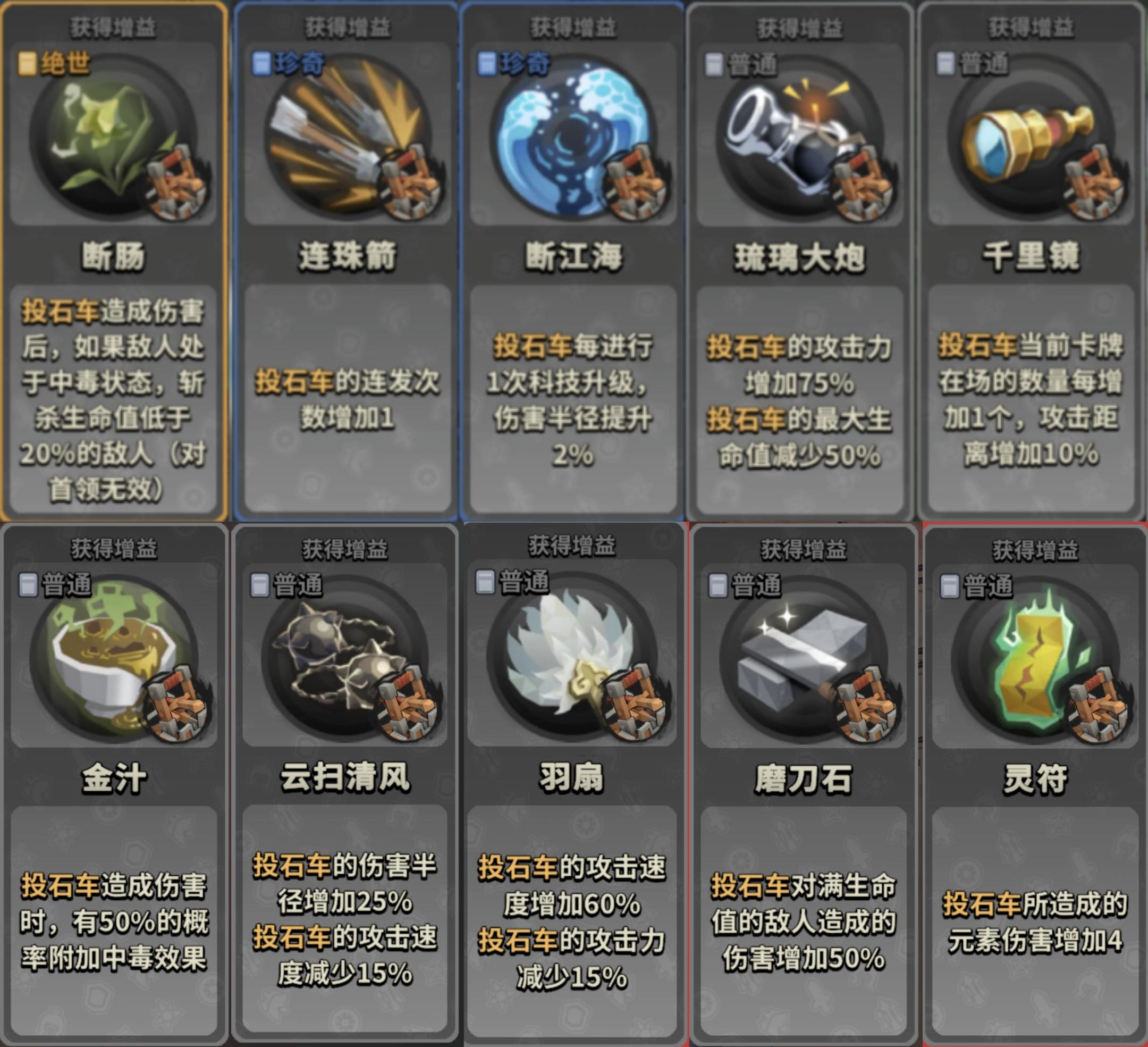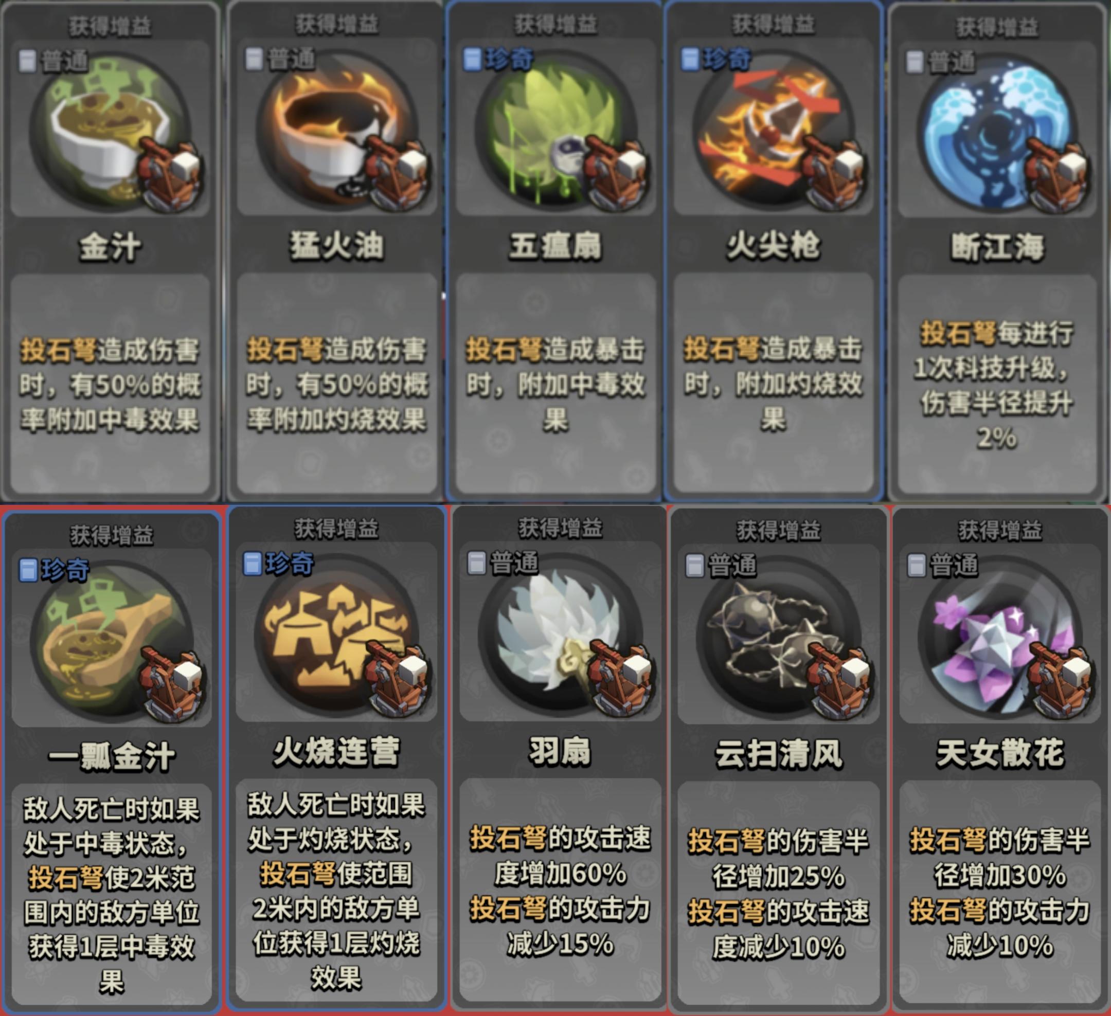 投石弩的buff一共有三类,为中毒,灼伤,扩大范围。