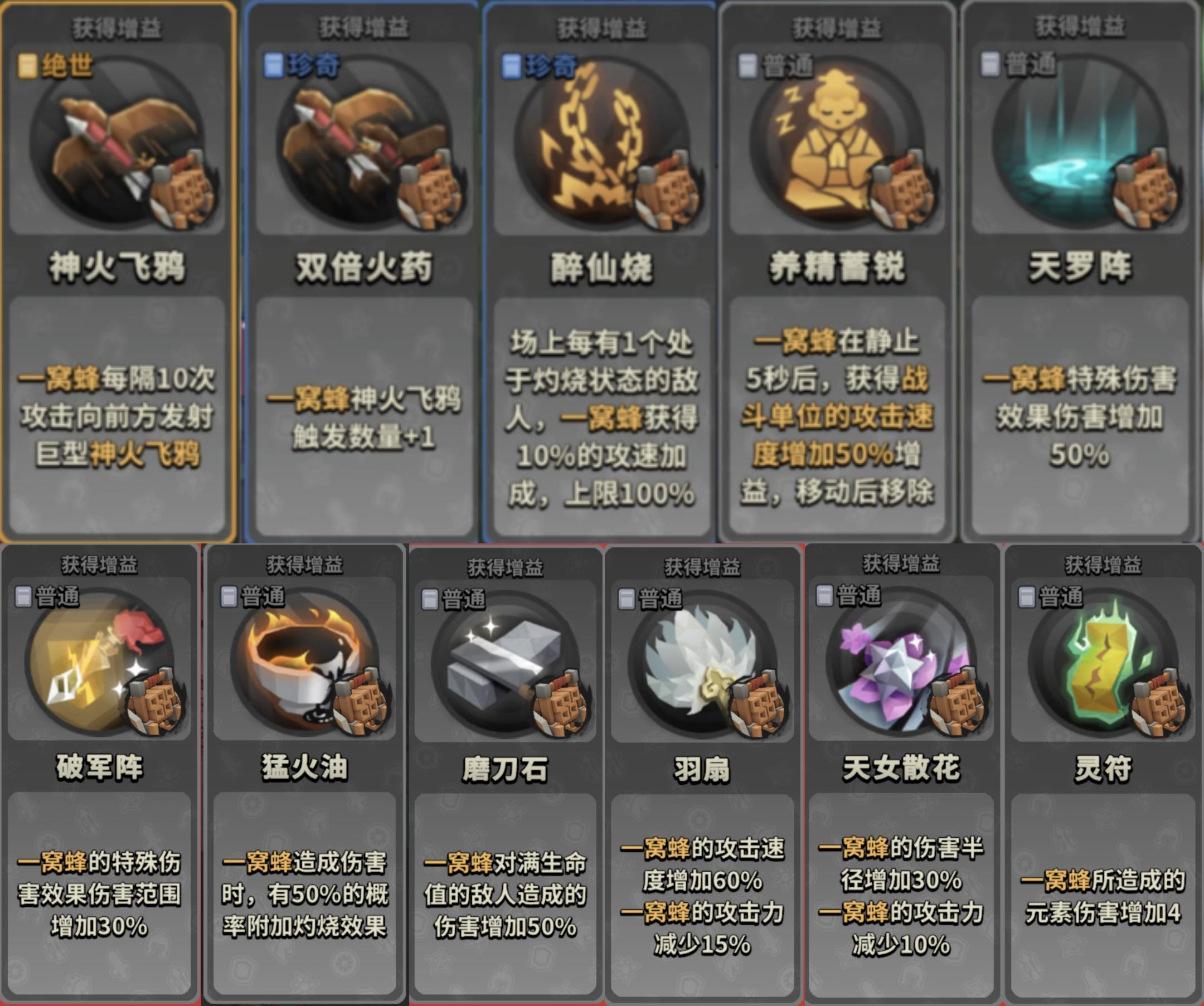 类似于投石弩的定位,给一窝蜂和红衣大炮打辅助。优先点灼烧状态的增益。
