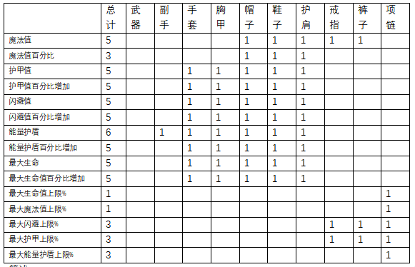 各个词条中魔法、护盾、生命值、护甲、闪避属性分布:
