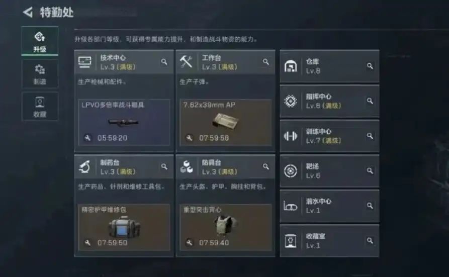 制造物品包括:【LPVO多倍率瞄准镜】【重型突击背心】【精密护甲维修包】【战地医疗箱】【DAR突击手弹挂】【7.62*39mm AP】【45-70 Govt FTX】【高级护甲维修组合】