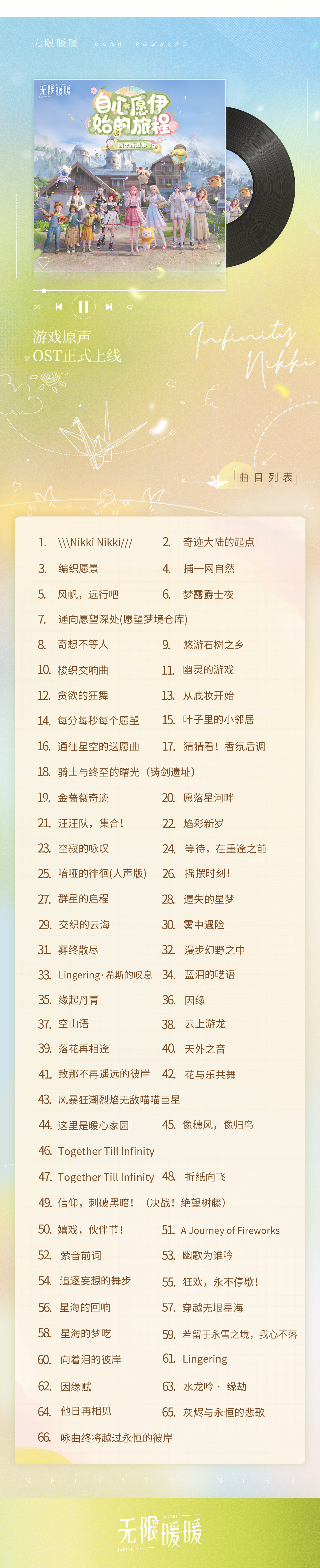 专辑共收录66首由叠纸旗下原创音乐团队FoldEcho出品并精选的原声音乐。