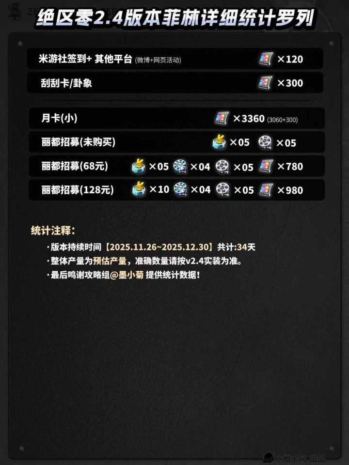 这一篇是v2.4新版本抽数统计,整体分为总体统计与各内容版块统计,总体统计分为了:零氪、小月卡与大小月卡,方便大家根据自身需求选择查阅。