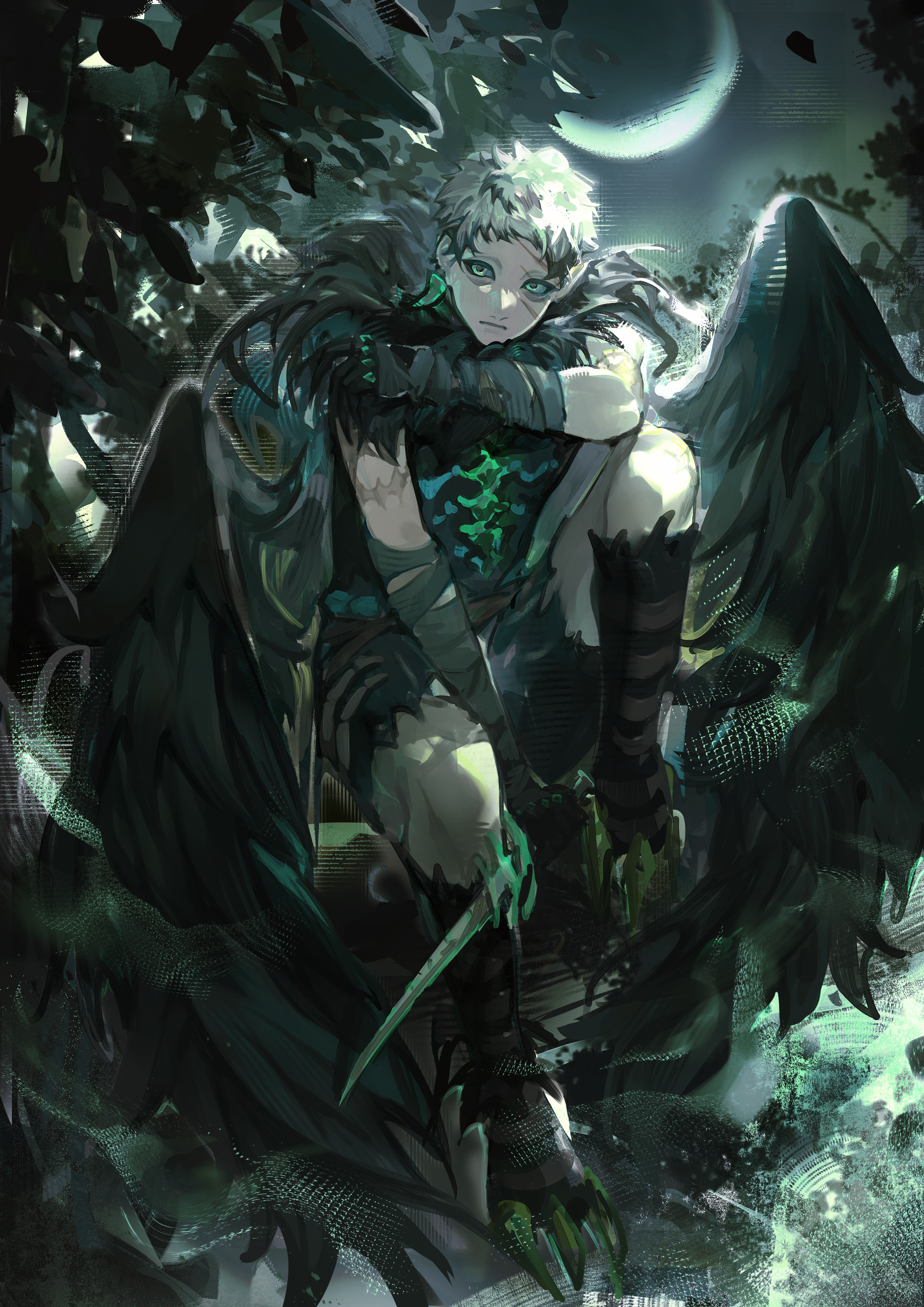 残月如钩,在云翳间投下清冷微光。翼独自立阴影交界处,翅膀下的衣服摆被夜风轻轻吹拂。