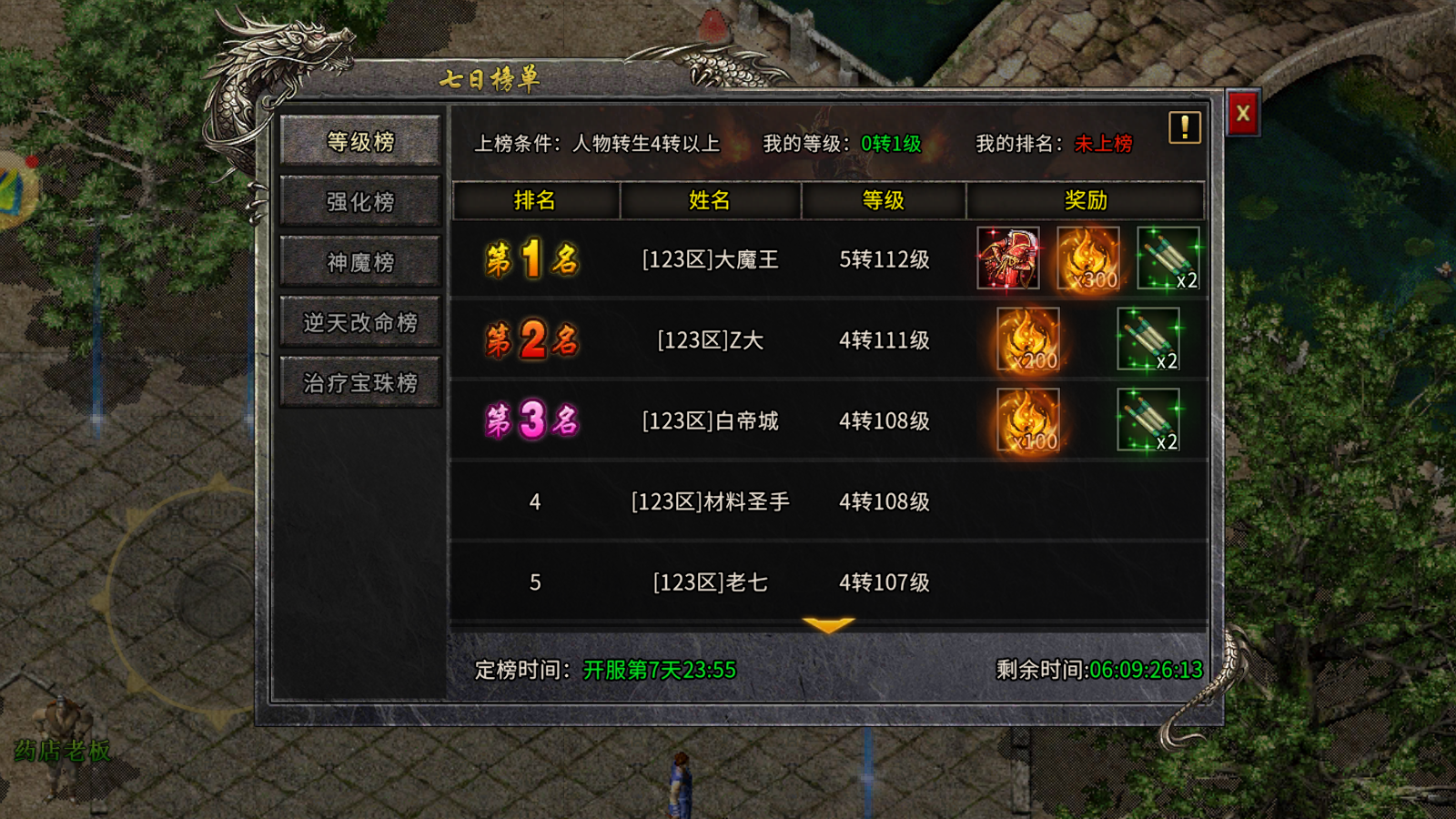 - 规则:开服第 7 天 23:55 定榜,同等级按达标时间排序,榜单入口定榜后 1 天关闭,奖励 2 分钟内邮件发放;
