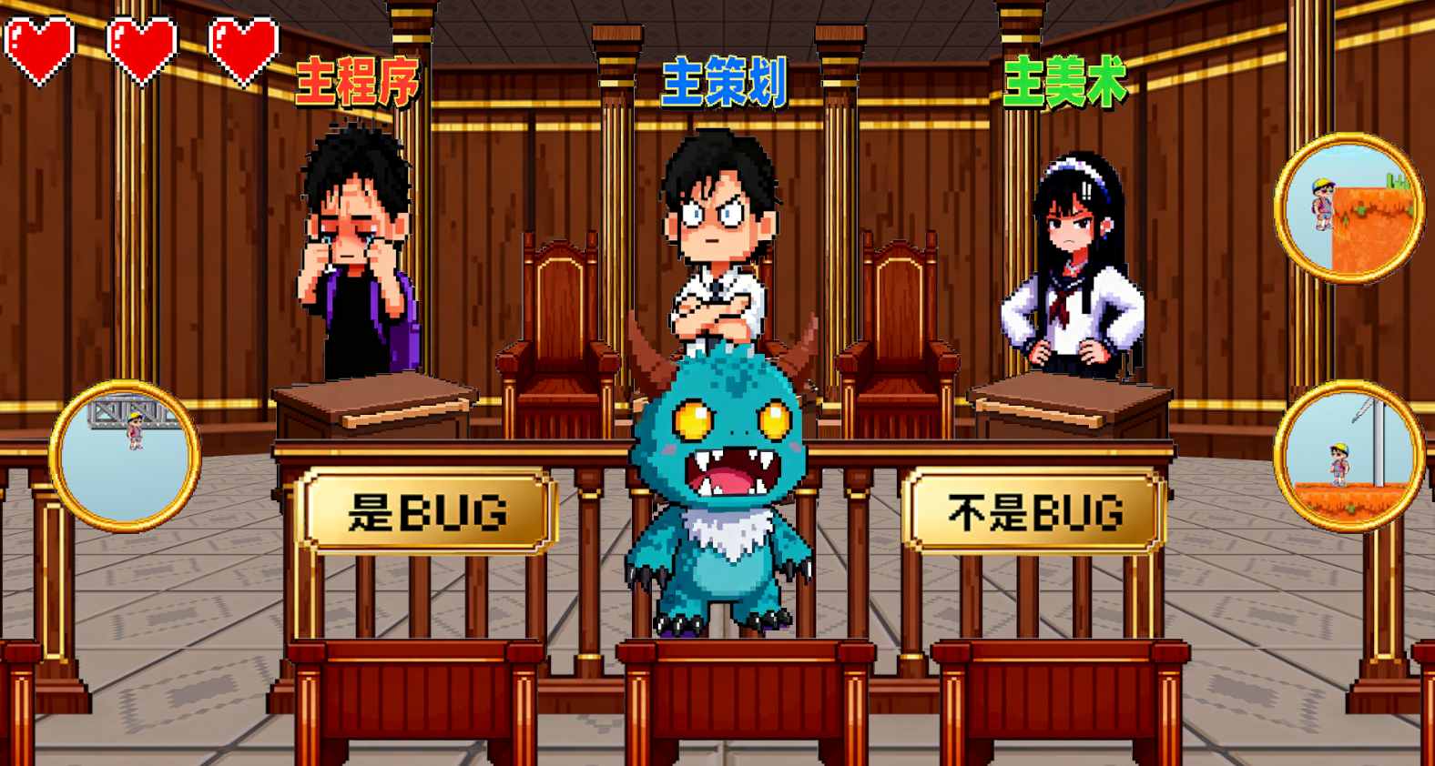我们需要在BUG小怪兽提问的时候选择判断是不是BUG,如果选择正确,则进入到下一个环节,如果选择错误,则会掉一滴血,直至GAME OVER:
