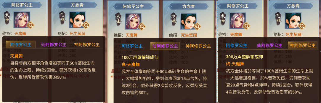 神阿修罗:增加全体100%生命上限同时还有回复等量血量、增加格挡、20%普攻免伤、受到普攻加4点神甲,这简直就是把全体伙伴的防御BUFF叠满了,尤其是免伤叠加加神甲(1神甲3%免伤)攻击力如果弱了根本就打不动,太强悍了。被普攻回复20点气势能快速让阿修罗再次释放绝技。持续2回合的4次反伤更是给力,实战中经常将对方将星反伤至残血甚至直接反死。相较之下仙阿修罗的2次反伤在两回合中,往往一个回合就消耗完了,明显不太够用。