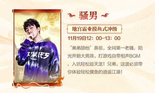 首发登场的是全网第一老骚——骚男,在中午12点至13点开启首场直播。他将带领少侠们体验地宫霸业摸鱼式冲级,用最轻松的方式快速升级,带兄弟们领略逍遥江湖的独特魅力。