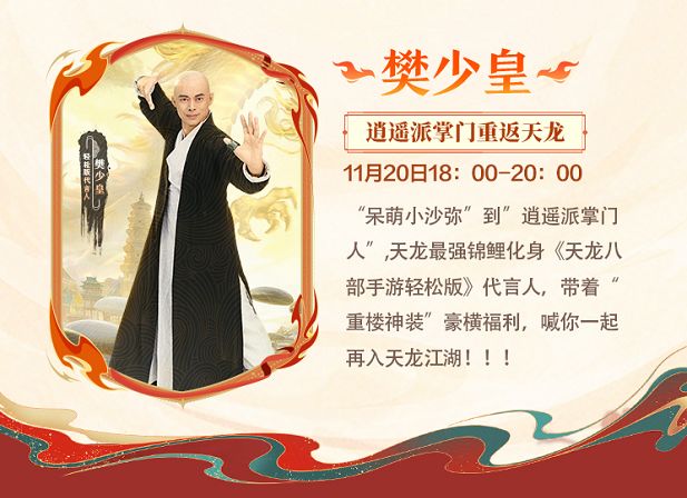 除了五大主播在公测当天全程陪玩,更有重磅惊喜紧随其后——11月20日晚间18:00-20:00,天龙轻松版代言人樊少皇,将亲临线上盛典,重返天龙江湖!