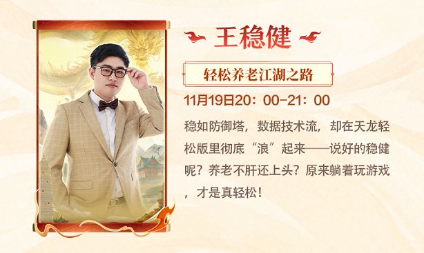 晚间20点至21点,王稳健接棒开播。一向稳如防御塔的他,这次要在天龙轻松版里彻底放飞自我,带领大家探索轻松养老的江湖之路,看他如何打破稳健形象,玩出全新花样。