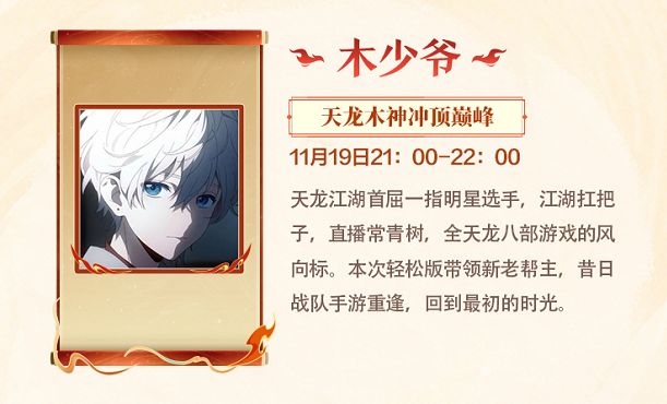 压轴登场的是木少爷,他将在晚间21点至22点,前往天龙轻松版冲击巅峰。他将集结新老帮主,重现经典对决,带领大家痛快战一场,重回那段热血沸腾的最初时光,彻底点燃你的江湖情怀!