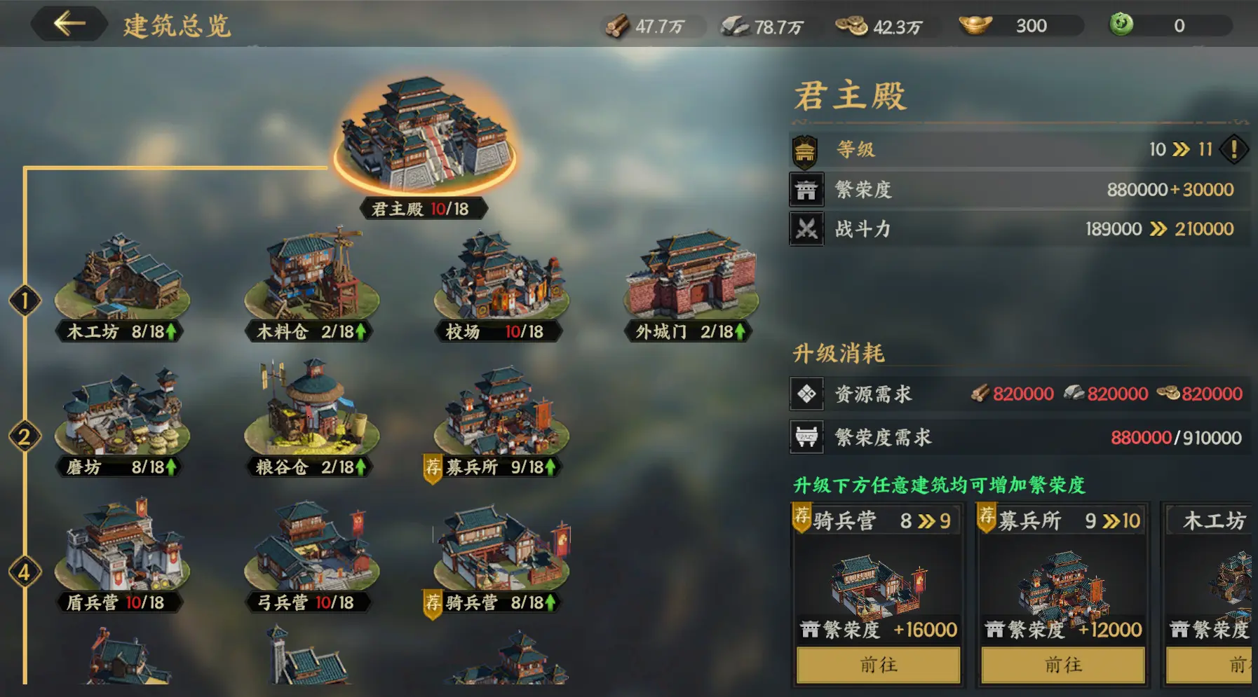 第一天君主殿基本达到8级及以上,在第二日资源足够时优先升级君主殿至10级,解锁更多共鸣槽位。