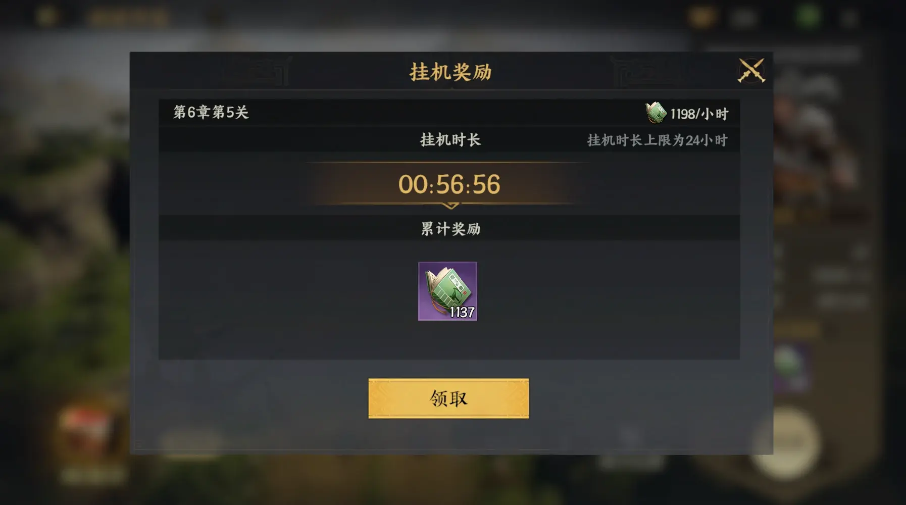 第二天及时领取破贼平寇挂机奖励,获取武将技能经验。讨伐成功章节数越多,挂机时长奖励越多,章节存在进度限制,每天0点增加。