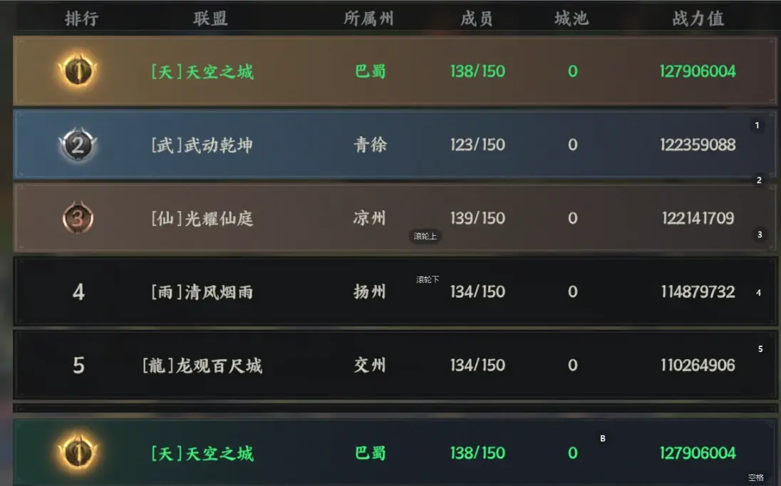S2-16区落地剑拔弩张,【天空之城】落地巴蜀以1.27亿战力稳居战力榜首,满编阵容尽显锋芒;【武动乾坤】四盟落地青徐,主盟手握1.2亿战力,三大分盟联合战力达3000 万,综合实力恐怖如斯;【涨停板】落在凉幽二州,双线布局直指凉州【光耀仙庭】,欲以两州夹击之势将其包围。