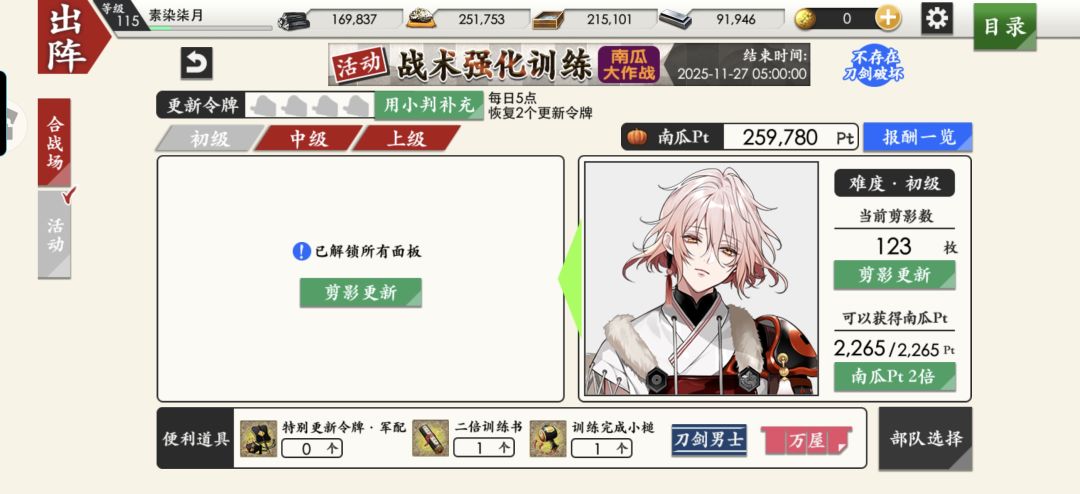 这次南瓜也算是完成任务了,后面随机刷乱舞叭,刀乱你真是一个睡眠质量杠杠的有游戏,最后刷八丁的时候困得眼睛要眯上了,差一点点就被我更新了,还好再次和剪影对比了一下,终于解放啦
