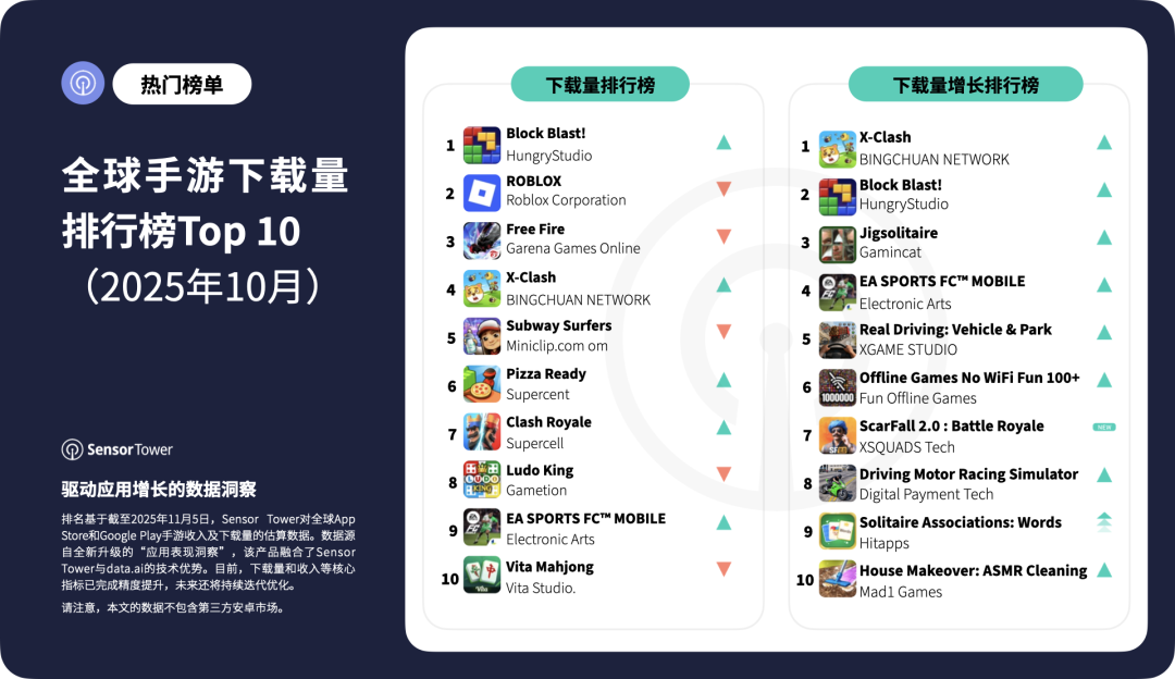 10月下载量趋势凸显了季节性活动、区域扩张和品类多样性之间的平衡。万圣节活动、文化联动和本地化发行,被证明在持续吸引玩家关注和推动全球下载增长方面极为有效,同时覆盖了休闲和中核两大用户群体。