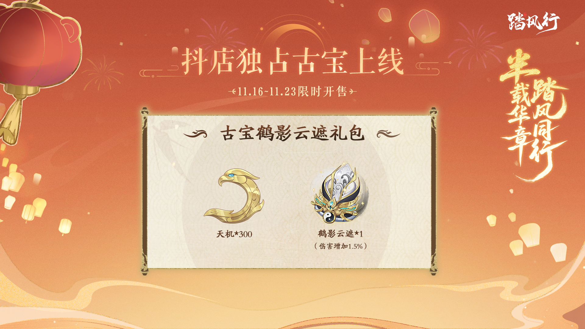 抖店独占古宝【鹤影云遮】11月16日~11月23日限时售卖!携带伤害增加1.5%的核心属性,堪称仙途战力万能buff,仅在抖店销售哦!收藏党、战力党闭眼锁定!