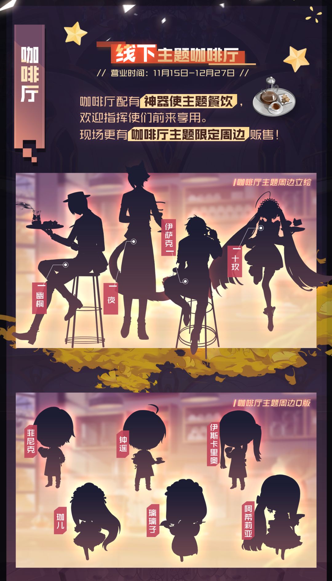 11月15日—12月27日线下咖啡厅限时营业啦!神器使主题餐饮等待指挥使们前来品尝,现场更有主题限定周边贩售,来打卡线下主题咖啡厅吧~