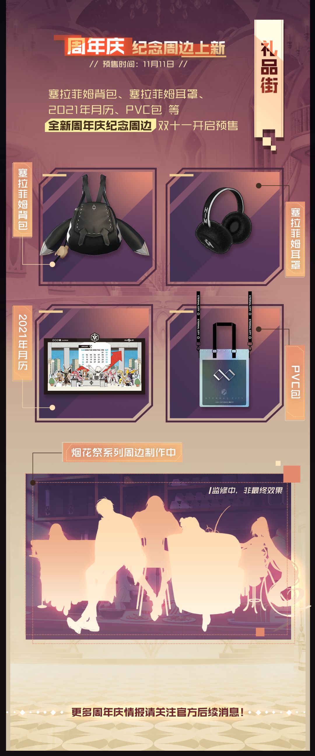周边商城上新,塞拉菲姆背包以及耳罩、2021年月历、PVC包等众多周年庆纪念周边双十一预售开启!烟花祭系列周边正在制作中,双十一和大家不见不散哦~