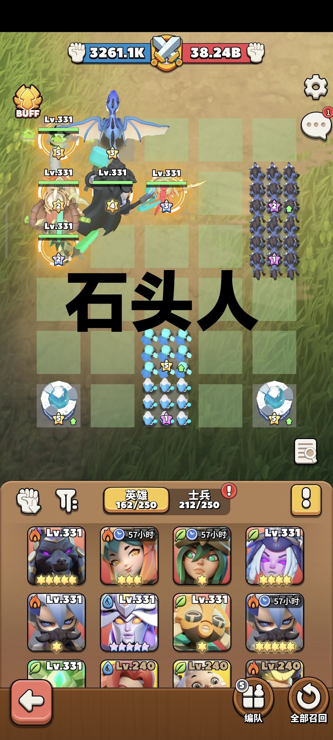 boss站位如图,其中石头人boss雷神可更换为牛大力,前期boss阵容五个英雄站满第一排,后面上满输出型小兵即可,当木蛇养成之后再改成图上站位。