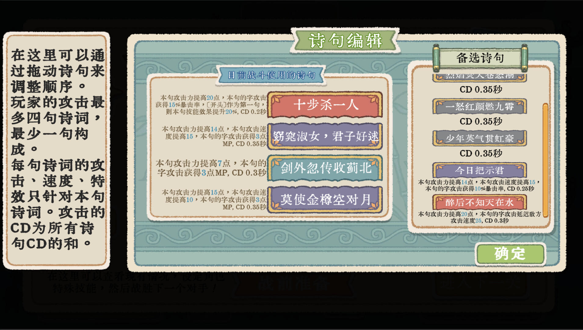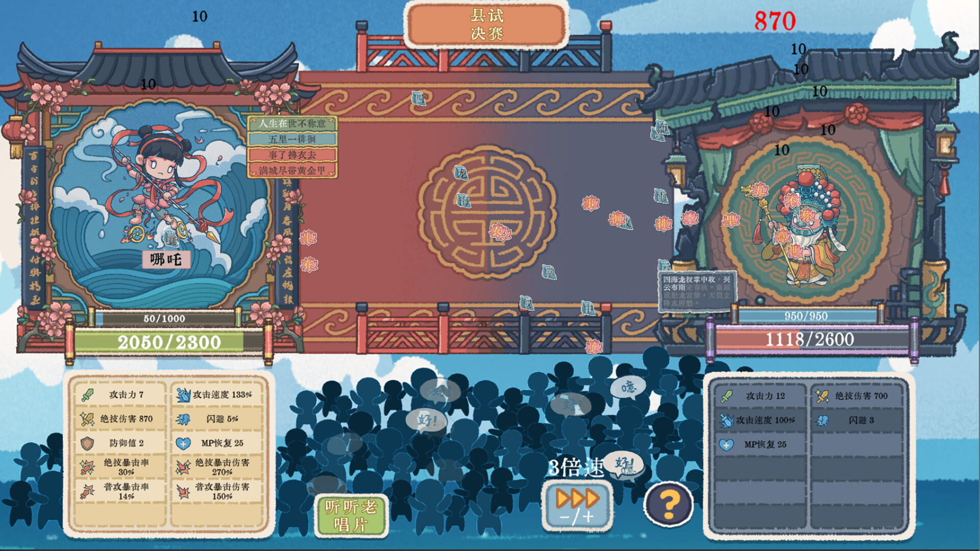 和古代的科举制差不多,最高是乡试(前面是院试),相当于闯关制,每个大的考试上面都会有初试以及最后的总考,难度也会随之上升,比如敌人的攻击力以及攻速都会上涨,玩家要做的,只是在对局结束之后选择对应的卡牌,虽然得不到想要的,但可以刷新。除此之外,还有一个摇色子的环节,摇出特定的骰型,就能获得对应的奖励,比较有用的是茶杯。